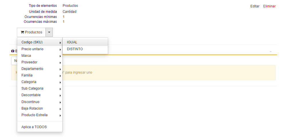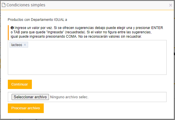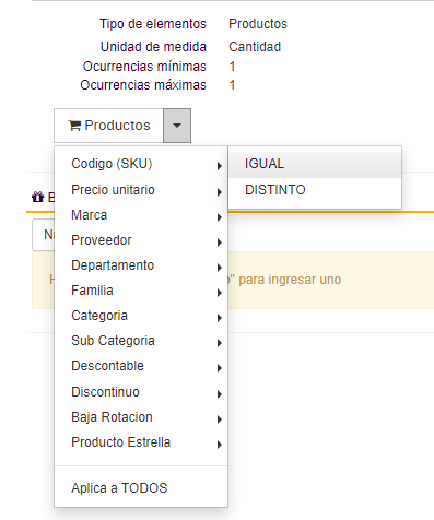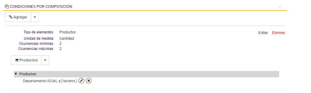 Luego de definir las ocurrencias, deberá de indicarse el atributo del producto que deberá considerarse para conformar la condición por composición, en este caso, "Departamento", igual a "Lácteos".