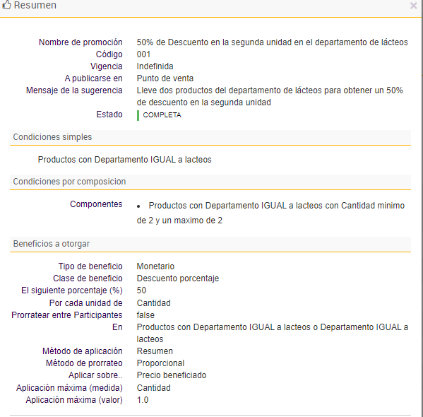 La promoción deberá definirse por medio de una condición por composición para que el motor genere subtickes cada dos elementos del departamento de lácteos que se ingresen a la transacción y aplicar sobre él el beneficio que se defina.