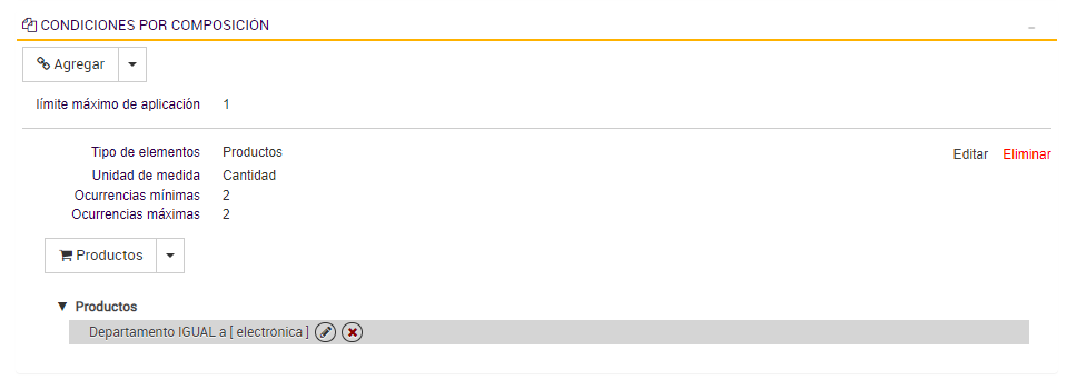 Luego de definir las ocurrencias, deberá de indicarse el atributo del producto que deberá considerarse para conformar la condición por composición, en este caso, "Departamento", igual a "Electrónica".