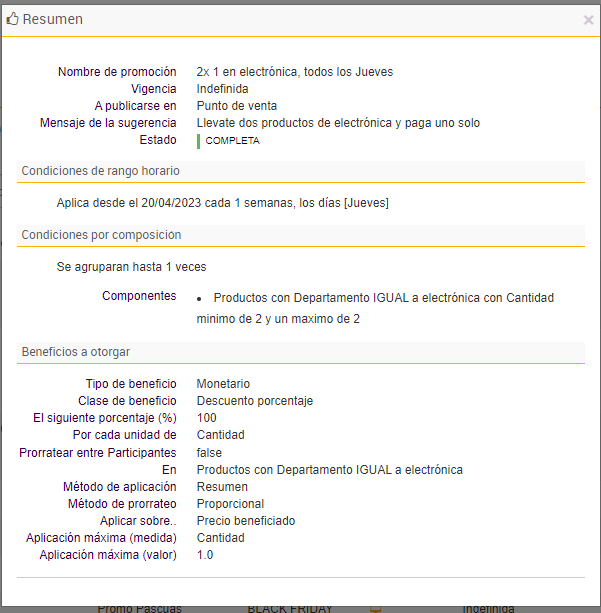 La promoción deberá definirse por medio de una condición por composición para que el motor genere subtickes cada dos elementos de electrónica que se ingresen a la transacción y aplicar sobre él el beneficio que se defina.