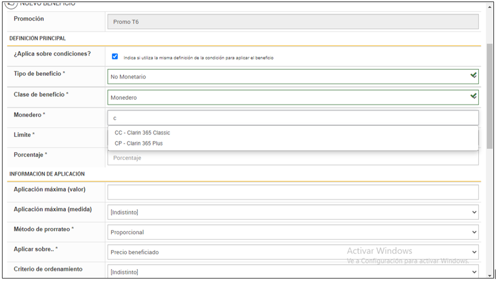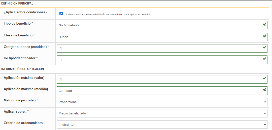 En caso de que se requiera acotar aun mas la aplicación del beneficio podrán especificarse mas datos en los campos "Método de Prorrateo", "Aplica sobre…" y "Criterio de Ordenamiento"