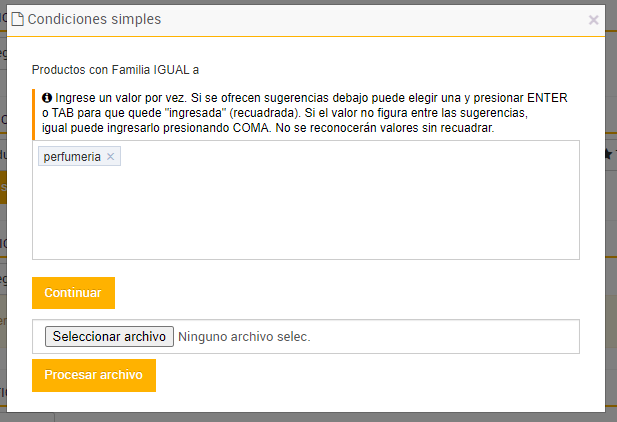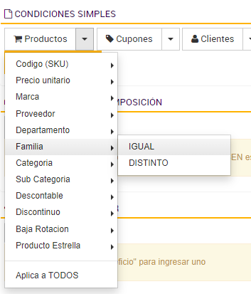 Para ello agregaremos un elemento del tipo producto, en la condición Simple indicando que deberán de pertenecer a la Familia "Perfumería"
