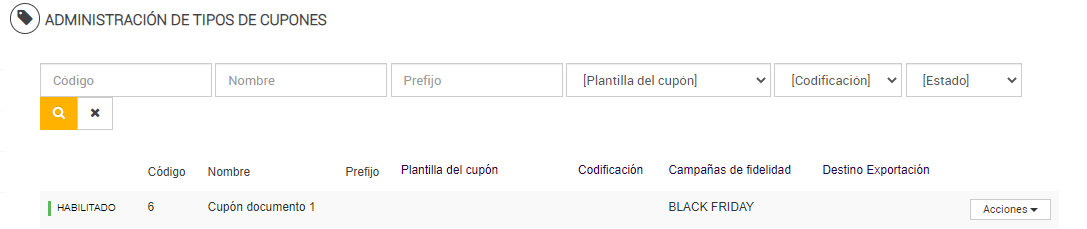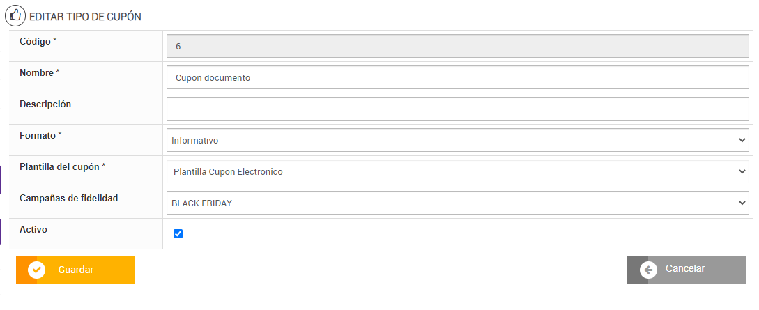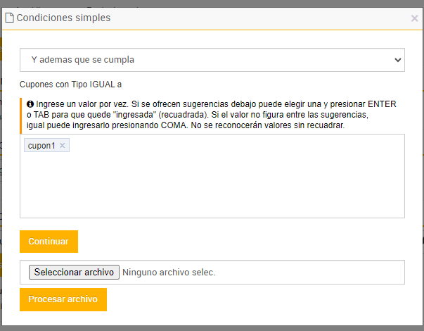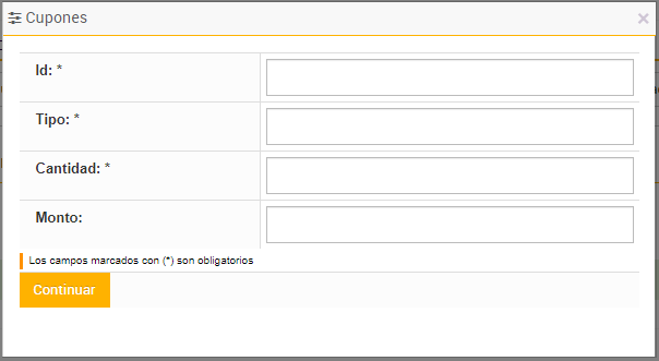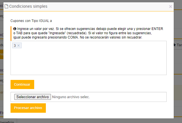 - En "De tipo/Identificador" se deberá especificar el tipo de cupón que se otorgara en este beneficio. El campo se autocompletara a medida que se vaya escribiendo, con los tipos de cupones ya cargados en la base y al seleccionarse una, en el campo se mostrara el ID del cupón seleccionado.