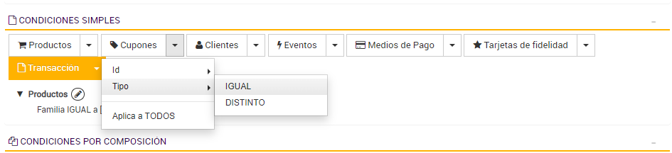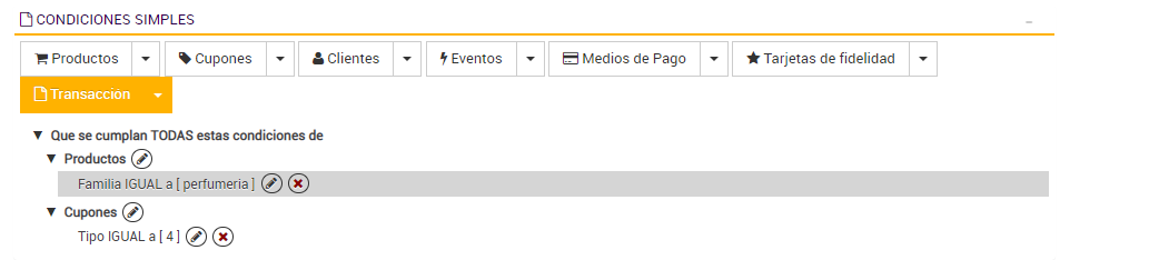 La promoción deberá definirse por medio de Condiciones Simples que evalúen la existencia de un Cupón del tipo "Calculado" (para nuestro ejemplo será un Cupón del Tipo "3") y al menos un producto de la Familia "Perfumería".