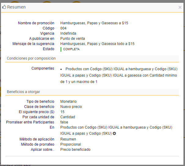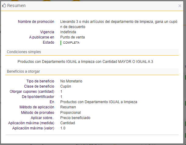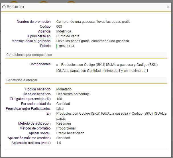 - La promoción Reportara participantes, por lo que el motor informara al punto de venta que elementos de la transaccion ocacionaron la aplicación del beneficio.