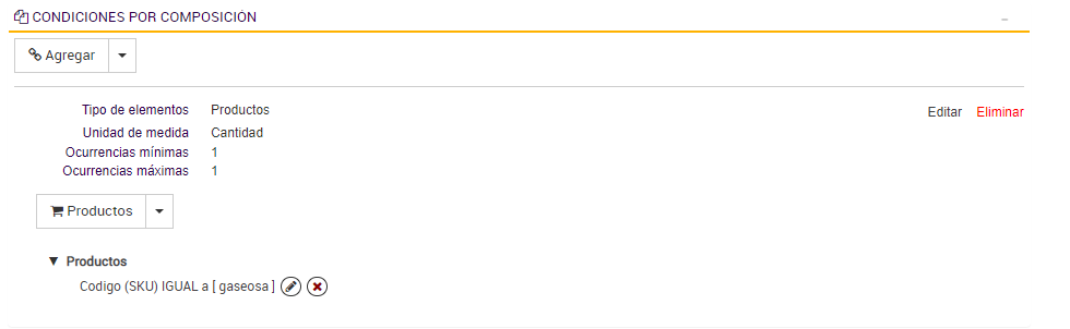 Ambas condiciones por composición tendrán definidas sus ocurrencias mínimas y máximas en 1, indicando en unidad de medida, "Cantidad".