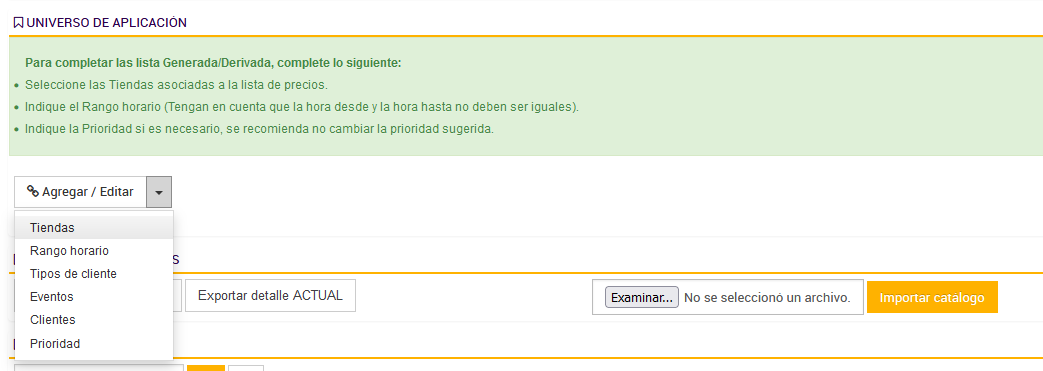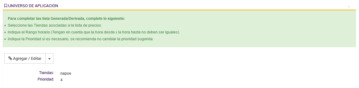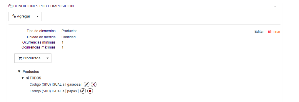 Para cada condición de composición deberá definirse su universo de aplicación, a la primera se le indicara el código de la gaseosa y a la segunda el código de las papas.