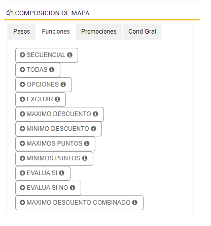 Por medio de la consola de promociones se realiza la definición de los mapas en los cuales se relacionan las promociones vigentes mediante reglas de convivencia y órdenes de aplicación.
