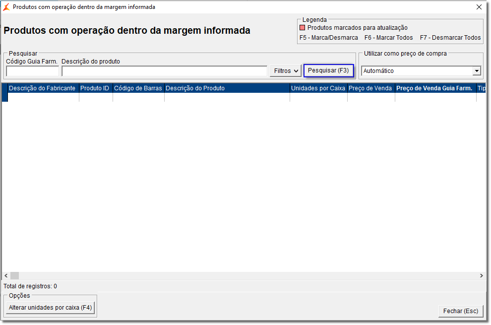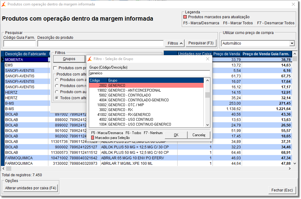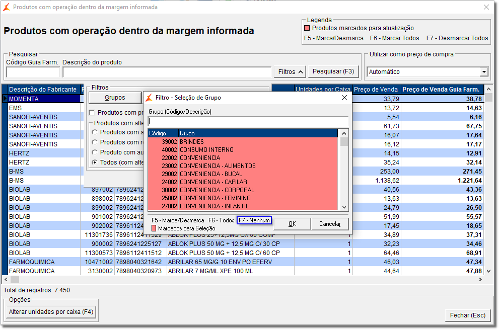 Por padrão todos os produtos vem marcados, é necessário desmarcar todos os produtos com a tecla (F7), para posteriormente poder marcar somente o grupo desejado.