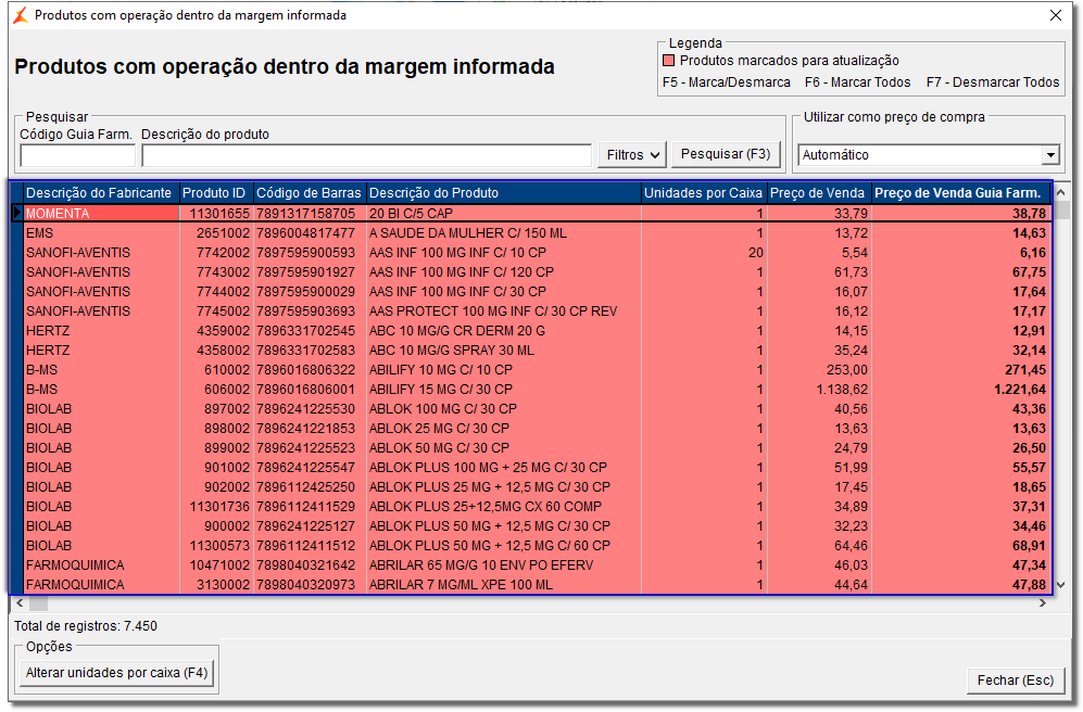 Marque os produtos um a um com as teclas de seleção padrão do Linx Farma Big, ou marque todos os produtos, restaurando assim a alteração inteira.