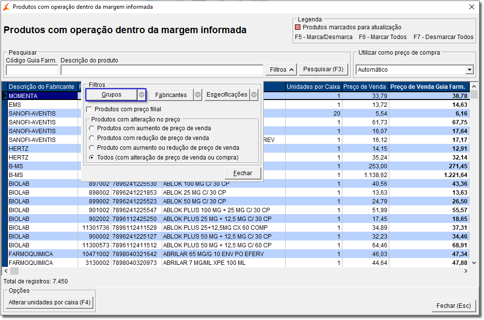 Figura 31 - Produtos com Operação Dentro da Margem Informada - Filtro - Seleção de Grupo