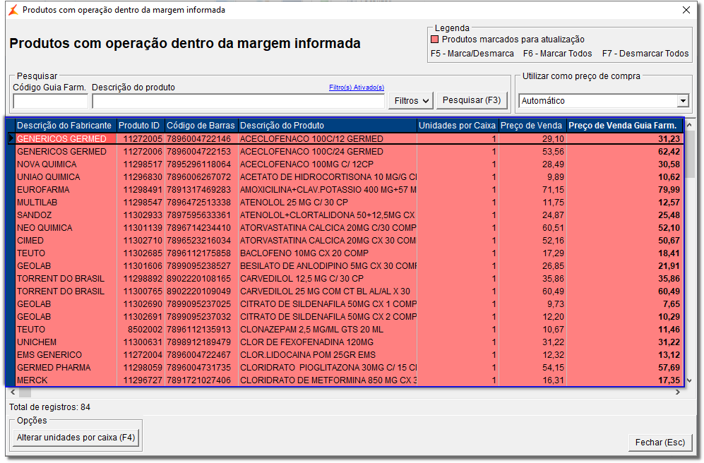 será exibida a tela com os produtos marcados para alteração que estão dentro da margem estabelecida, e portanto, com uma maior segurança para atualização dos preços.