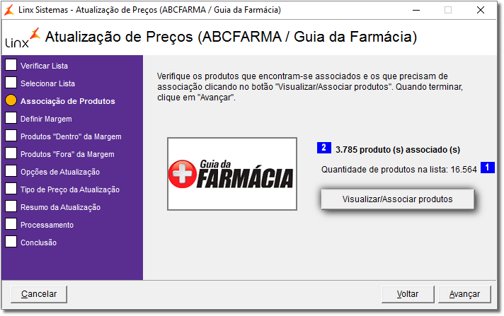Nessa tela é possível verificar a quantidade dos produtos constantes na lista escolhida (ABCFarma ou Guia da Farmácia) e também a quantidade de produtos associados com a base de dados do cliente