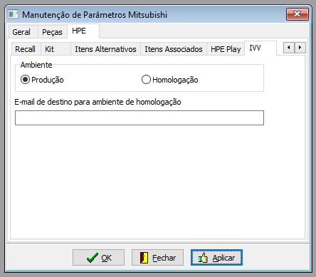 Neste menu é possível indicar se o processo do envio de e-mail do IVV será realizado no ambiente de produção (envio para a HPE) ou homologação (envio para o e-mail parametrizado no campo E-mail de destino para ambiente de homologação).