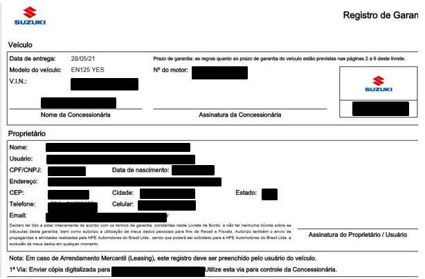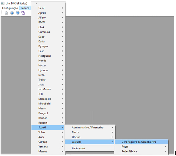 Acessar o menu "Fábrica > Suzuki > Veículos > Gera Registro de Garantia HPE"