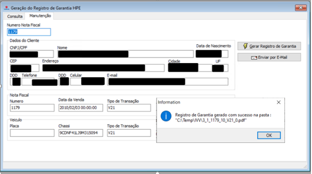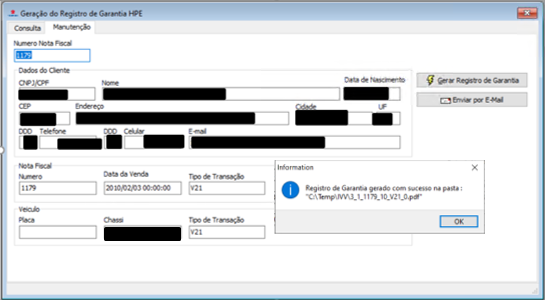 Clique em "Gera Registro de Garantia". Após a geração será apresentada na tela a mensagem informando o local onde o arquivo foi salvo.