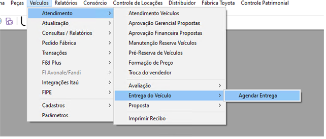 Acessar o menu "Veículos > Atendimento > Entrega do Veículo > Agendar Entrega" através do Linx DMS HPE