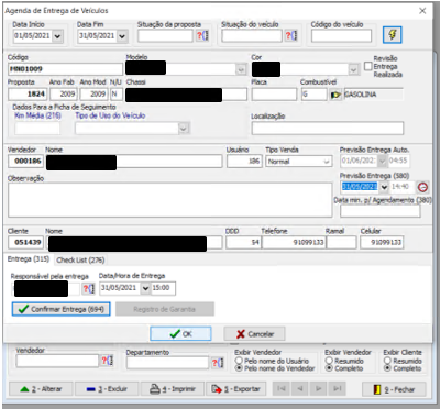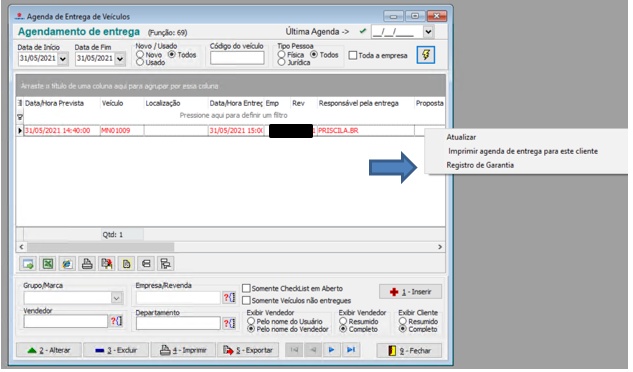 Observação: O menu " Registro de Garantia " só deve estar habilitado quando estiver selecionado no grid um agendamento com um "Veículo Novo" e "Data de Entrega" preenchida.