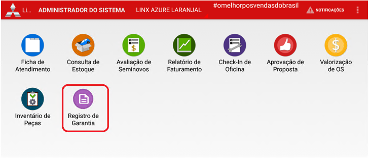 Acesse o app “Linx DMS Mobile HPE” com seu “Usuário” e “Senha”. Após, selecione o ícone "Registro de Garantia".