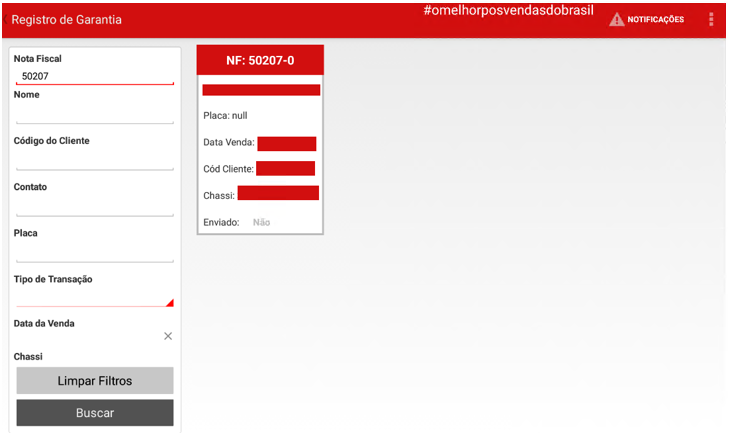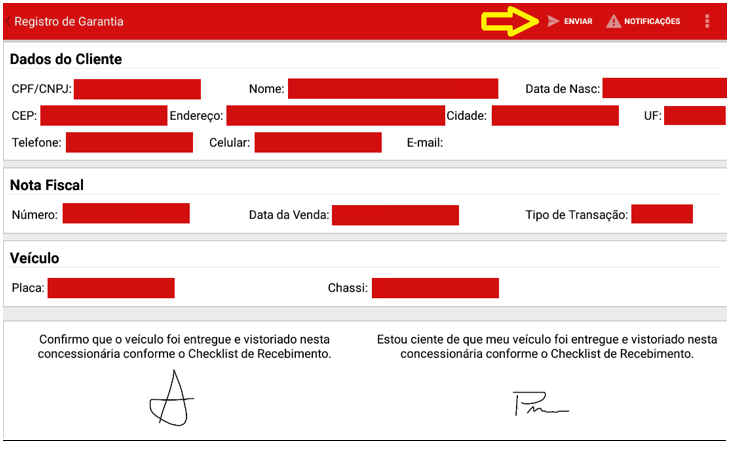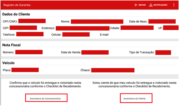 Após clicar no resultado apresentado, será listado o registro com mais detalhes do cliente e da nota fiscal. Nesta tela será coletada a “Assinatura da Concessionária” e “Assinatura do cliente”.