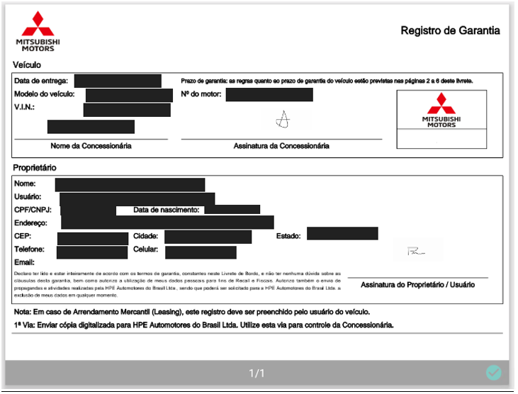 Após, será apresenta a tela do "Registro de Garantia" com as assinaturas gravadas.