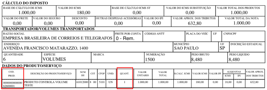 Onde 8280000001- 4, 5 e 6 referem-se ao código de barras dos volumes configurados no cadastro do produto. Observe que o sistema usou a segunda versão de volumes cadastrada para o produto, porque ela é a mais recente.