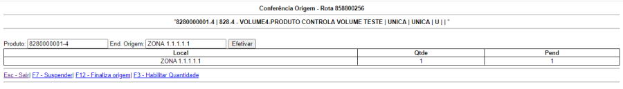 No coletor de dados, será exibido um volume por vez, para que a conferência do local de origem seja feita. O usuário deverá informar o código do volume para conferir.