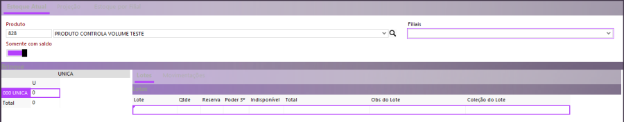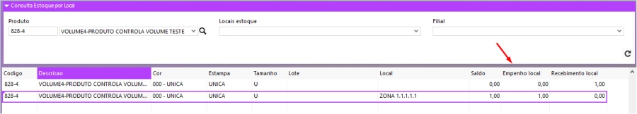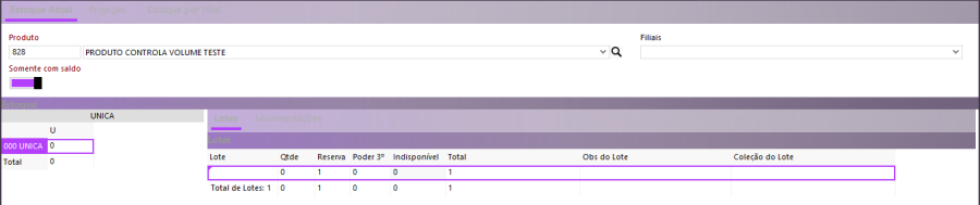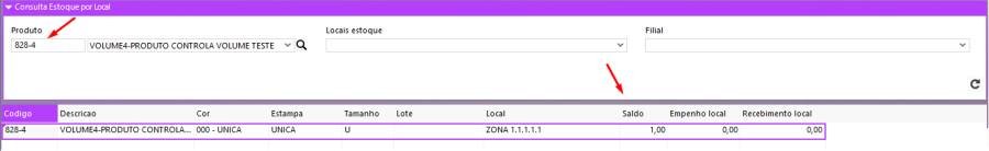 Após finalizar a conferência de destino, faremos uma nova consulta no estoque de volumes. Perceba que não há mais nenhum dos volumes referentes ao produto 828. Feita a separação, o estoque de volume deve ser baixado. Nesse exemplo, ele foi zerado porque demos entrada em apenas uma unidade do produto acabado, para demonstrar o funcionamento do recurso. O mesmo não pode ocorrer com o estoque do produto acabado. Este deve permanecer até o faturamento do pedido de venda.