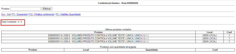 A regra de WMS usada definiu que os locais de destino já estariam conferidos, portanto aqui temos apenas que finalizar a conferência de destino. Observe que o totalizador mostrar que os três itens foram conferidos.
