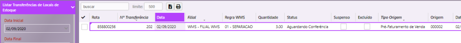 Para conferir pelo coletor de dados, vamos consultar a rota de conferência gerada, em Logística\WMS\Transferência de locais de estoque.