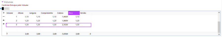 Comece preenchendo as colunas das medidas. A coluna Volume será preenchida pelo sistema, assim que o cursor passar para a linha seguinte. E a coluna Versão será preenchida assim que a alteração no cadastro do produto for efetivada.