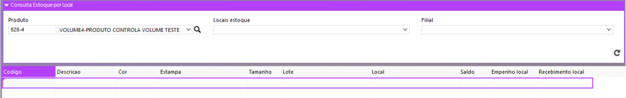 Para consultar o estoque dos volumes, teremos que usar o código gerado pelo sistema e não o código do produto acabado, do qual o volume se originou. Em Logística\WMS\Consulta estoque por local, podemos ver a quantidade de cada volume lançado em seu local. Na imagem podemos ver o lançamento do volume 4 e uma quantidade respectiva. Consulte também os volumes 5 e 6 e verá que o mesmo saldo será exibido para cada um.