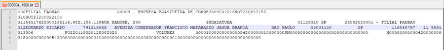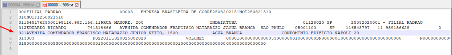 Em Logística\TMS\Integrações\Transportadoras\Notas Fiscais (NOTFIS), vamos gerar um arquivo com o parâmetro desligado. Perceba que o complemento do endereço não foi inserido no arquivo.