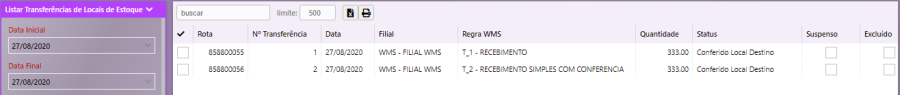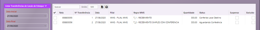 Em Logística\WMC\Transferência de locais de estoque, podemos consultar as transferências geradas pelo evento de entrada e observar que estão finalizadas.