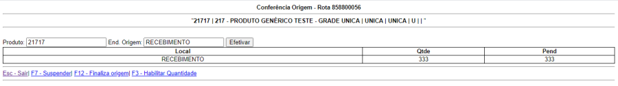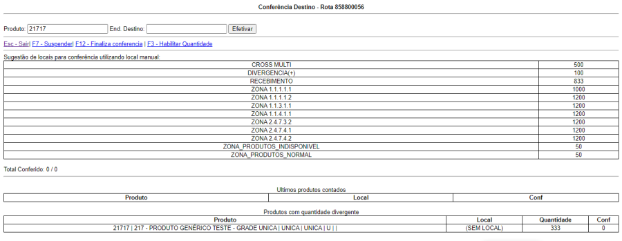 Ao finalizar a conferência de origem, inicie a conferência de destino. Assim que o código de barras do produto for lido, o sistema exibirá, na tela do coletor, todos os locais em que houver armazenagem deste produto e o usuário poderá definir o local mais conveniente. Selecionado o local, informe a quantidade e efetive. Vamos selecionar o local ZONA 1.1.1.1.1 e finalizar a conferência.