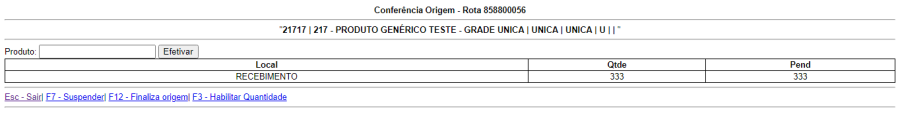 Então, temos o produto a ser conferido, que está no local "RECEBIMENTO" aguardando para ser armazenado.