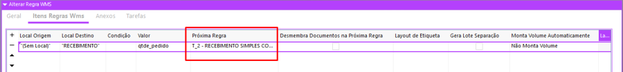 Na guia Itens da Regra WMS, na coluna Próxima Regra, deverá ser selecionada a segunda regra a ser configurada para usar nesse processo.