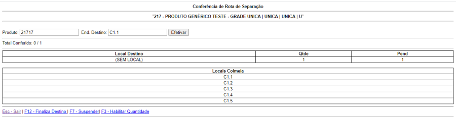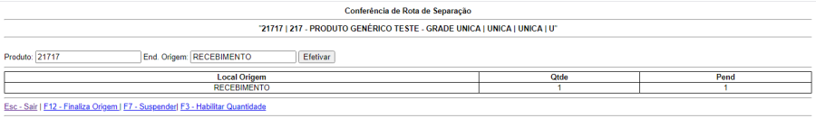 Entre com o código do produto e seu local de origem. Ao efetivar, o sistema não irá solicitar o lançamento do produto seguinte, como ocorre no tipo Fixo de conferência.