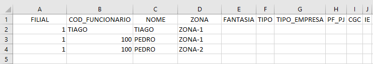 Atenção! Os nomes das colunas não devem ser alterados, para que o sistema possa fazer a importação das informações corretamente.