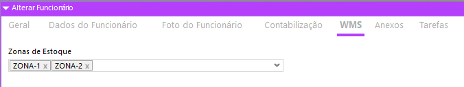 Vamos voltar ao cadastro de funcionários, em Utilitários\Empresa, e consultar as informações importadas via planilha. Na importação enviamos dois funcionários, um deles, Tiago, para atualização, informando apenas a zona a ser preenchida no cadastro e o outro, Pedro, para inserir no cadastro como novo funcionário. Ao consultar o cadastro de funcionários, veremos que o Pedro foi incluído no sistema e, na guia WMS, podemos visualizar as zonas às quais ele terá acesso.