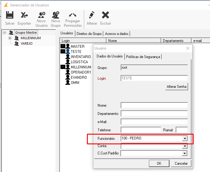 Selecione o grupo no qual o funcionário será vinculado, localize o usuário e ao clicar duas vezes sobre o usuário TESTE, abrirá uma nova janela, onde poderemos selecionar o nome do funcionário.