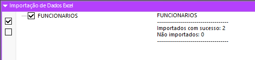 Na mesma tela onde o modelo para preenchimento foi exportado, clique no link Carregar Planilha de Excel. Selecione a planilha, clique em Abrir. A seguir, selecione a opção FUNCIONÁRIOS e clique no link Importar Selecionados. Aguarde a mensagem de importação realizada com sucesso e observe que o sistema exibe na tela o resultado da importação.