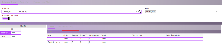 Porém, de acordo com a configuração, o sistema reservou no estoque a quantidade do produto ALTERNATIVO_1, obedecendo a ordem de entrada no estoque.