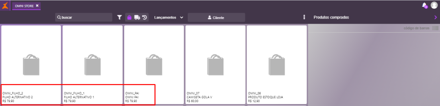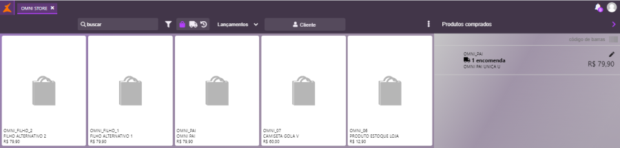 Na tela de vendas, serão visualizados os três produtos cadastrados, porém faremos uma venda com encomenda para o produto OMNI_pai.
