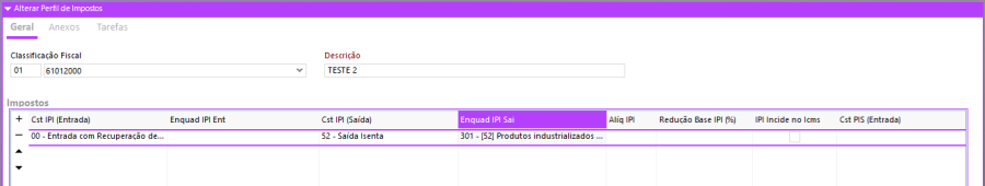 Para atender esta necessidade, foi inserida uma coluna no cadastro de perfil de impostos, na qual o usuário irá selecionar o enquadramento do IPI. No evento de faturamento de venda, o sistema irá considerar o enquadramento que estiver definido no cadastro do perfil de imposto do produto.