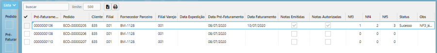 Para consultar a situação do pedido de venda, acesse novamente em Mobly\Lista de Pré-Faturamentos e perceba que o sistema mostra que as notas foram emitidas, autorizadas pela Sefaz e a numeração da nota em cada evento respectivo: NF3, NF4 e NF5.