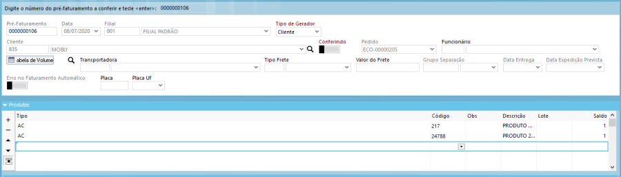 Em Logística\Expedição\Expedição de Pré-Faturamento de Saídas, preencha o campo com a numeração do pré-faturamento, ou faça a leitura do código de barras, para iniciar a conferência.