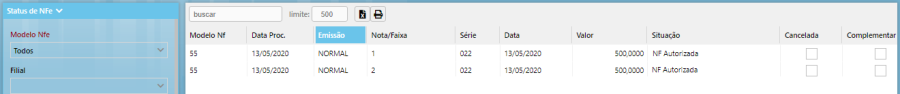 Feita a conferência de todos os itens, o sistema irá faturar e emitir a nota fiscal automaticamente. Em Vendas/Status NFe, faça uma consulta e visualize as notas emitidas para os pedidos do lote de separação.