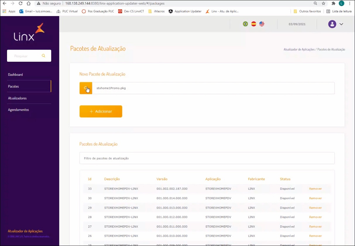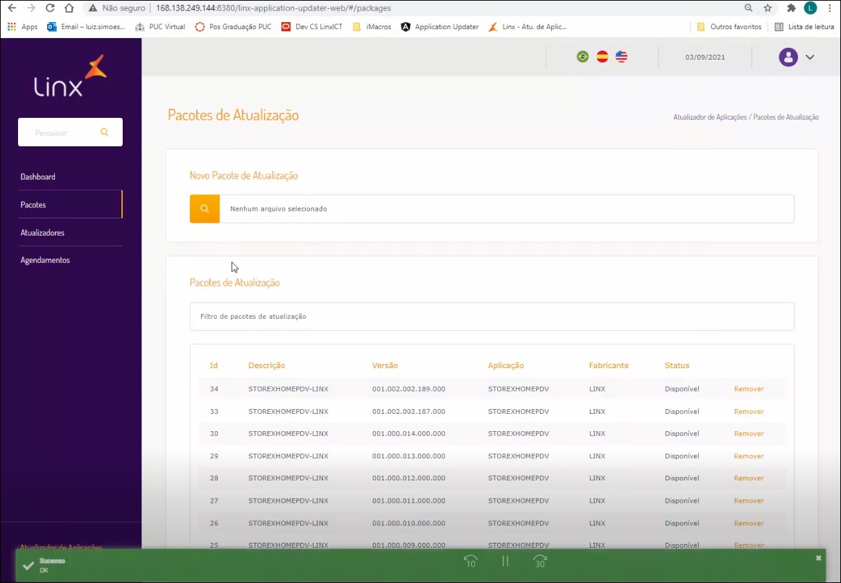 *Obs.: Caso o pacote seja grande, apresentará uma barra de progresso mostrando como está sendo o upload até concluir e apresentará ao final um modal de sucesso listando a versão no "Pacotes de Atualização".