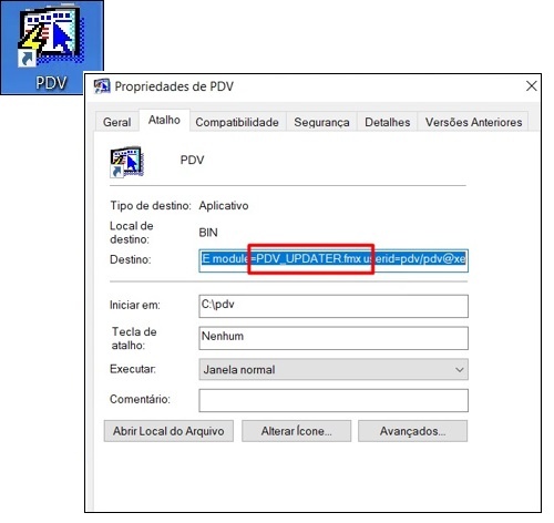O cliente precisará clicar com o botão direito do mouse no ícone de atalho que do PDV e alterar na aba "Atalho", em "Destino", o parâmetro de: "module=PDV_NEW.fmx" para: "module=PDV_UPDATER.fmx".